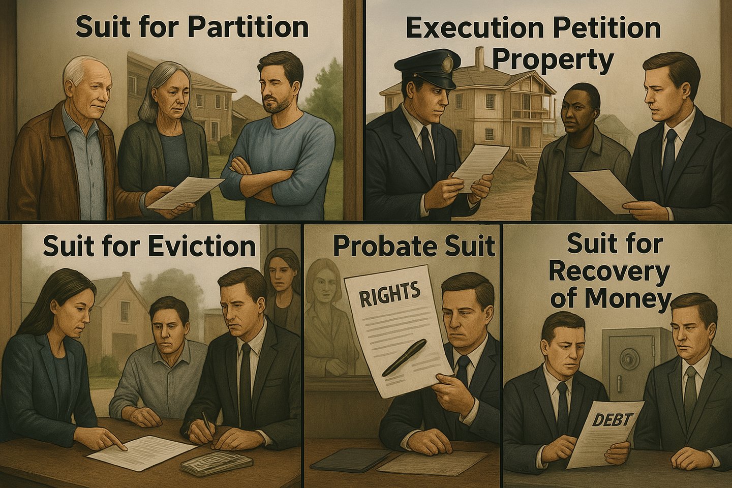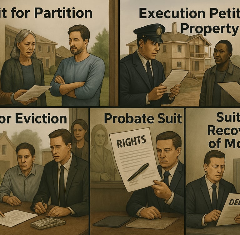Partition, injunction, probate, eviction, damages, performance, recovery, declaration.